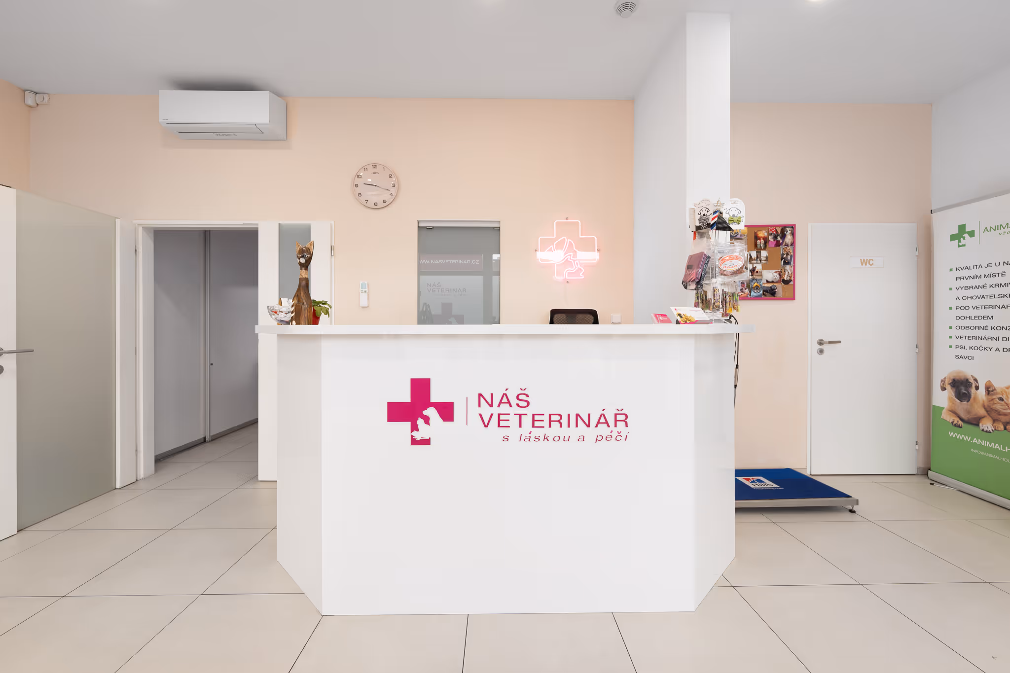 Naše pracoviště o rozloze 142 m² nabízí prostornou a klidnou čekárnu, dvě plně vybavené ordinace, samostatnou místnost s laboratoří a RTG, vyhřívané hospitalizační boxy i operační sál – vše pro pohodlí